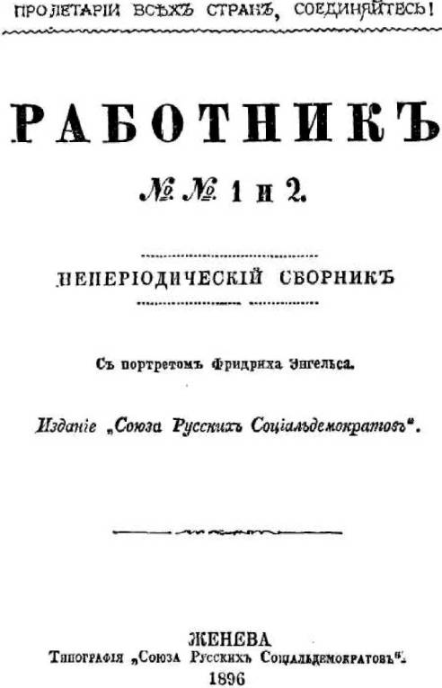 Титульный лист сборника «Работник», в котором впервые была напечатана статья-некролог В. И. Ленина «Фридрих Энгельс». - 1896 г.